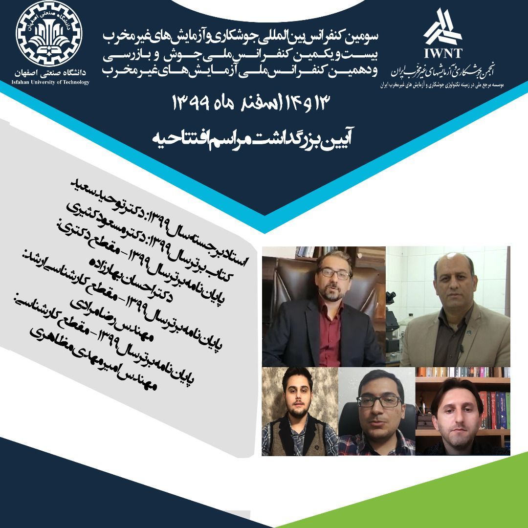 بیست و یکمین کنفرانس ملی جوش و بازرسی و دهمین کنفرانس ملی آزمایش های غیرمخرب همزمان با سومین کنفرانس بین المللی جوشکاری و آزمایش های غیرمخرب ایران ۱۳ و ۱۴ اسفند در اصفهان برگزار شد.