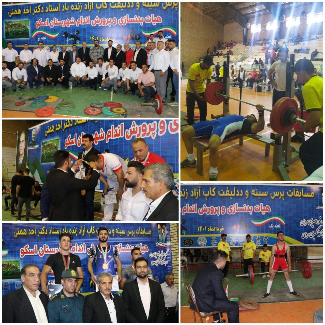 این مسابقات در دو بخش پرس سینه و ددلیفت با شرکت ۴۰۰ ورزشکار در چهار رده سنی پیشکسوتان، بزرگسالان، جوانان و نوجوانان از استان ها و شهر های مختلف کشور و با حضور ستوده نژاد مدیر کل ورزش و جوانان استان، فیروزی فرماندار شهرستان اسکو، نیک رزم رئیس هیئت بدنسازی و پرورش اندام استان و پیشکسوتان و قهرمانان این رشته بصورت با شکوه برگزار و در پایان نتایج تیمی ذیل حاصل شد: