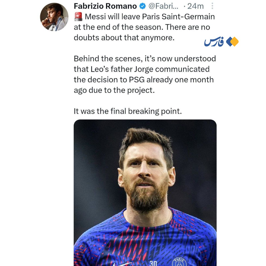 پس از محرومیت ۲ هفتهای لیونل مسی به دلیل سفر غیرمجاز به کشور عربستان، دقایقی پیش خبرنگار مشهور فوتبال اروپا از پایان داستان این فوق ستاره با باشگاه پاری سن ژرمن خبر داد.