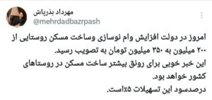 ، مهرداد بذرپاش – وزیر راه و شهرسازی در پیامرسان ایکس (توییتر سابق) نوشت: “امروز در دولت افزایش وام نوسازی و ساخت مسکن روستایی از ۲۰۰ به ۳۵۰ میلیون تومان به تصویب رسید. این خبر خوبی برای رونق بیشتر ساخت مسکن در روستاهای کشور خواهد بود. درصد سود این تسهیلات ۵ درصد است. ”