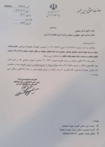در مکاتبه اخیر معاونت حقوقی ریاست جمهوری آمده است که «در خصوص ابهامات مطروحه پیرامون «واریز معادل دوازده در هزار ارزش گمرکی کالاهای وارداتی موضوع ماده ۴۲ قانون مالیات بر ارزش افزوده مصوب ۰۲/۰۳/۱۴۰۰ مجلس شورای اسلامی به حساب تمرکز وجوه وزارت کشور» به استحضار میرساند: حکم ماده ۴۲ قانون مالیات بر ارزش افزوده قانون مالیات بر ارزش افزوده مصوب ۰۲/۰۳/۱۴۰۰ مجلس شورای اسلامی که در ذیل فصل نهم (تخصیص انتقال و توزیع مالیات) ذکر شده صرفا مربوط به توزیع مالیات بر ارزش افزوده بوده و متضمن اخذ عوارض جدید از صاحبان کالا علاوه بر ۹ درصد مالیات بر ارزش افزوده مقرر در ماده (۷) قانون مذکور نمیباشد».