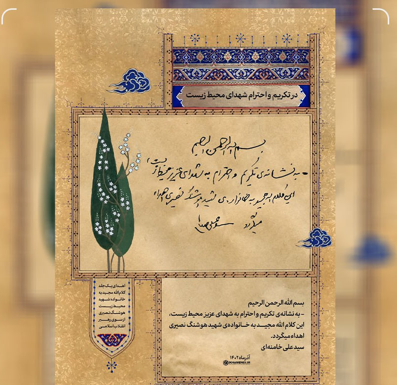 حضرت آیتالله خامنهای به نشانه تکریم و احترام به شهدای محیط زیست، یک جلد کلامالله مجید به خانواده شهید محیط زیست هوشنگ نصیری اهدا کردند.