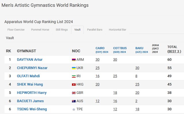مهدی الفتی ملیپوش ژیمناستیک ایران در رنکینگ فدراسیون جهانی ژیمناستیک با ۴۹ امتیاز در رده سوم وسیله پرش خرک قرار دارد.