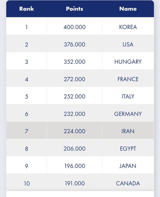 در بخش تیمی هم ایران همچنان رده هفتم رنکینگ جهان را حفظ کرده است.