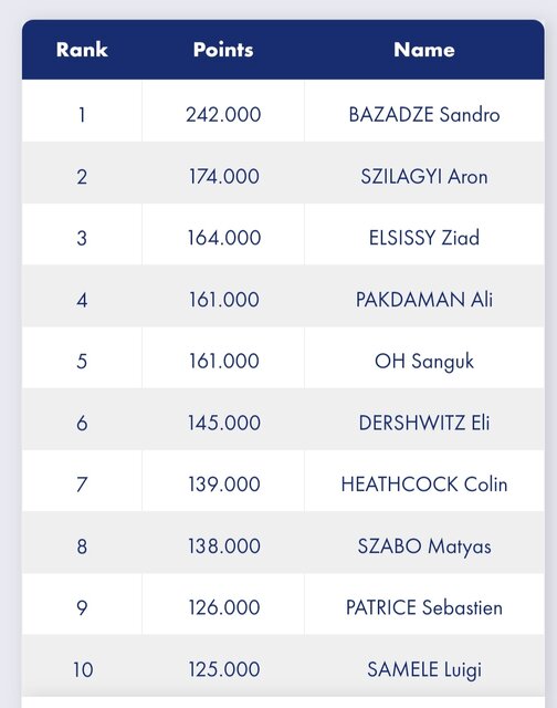 رنکینگ جدید شمشیربازان به شرح زیر است:( اعداد داخل پرانتز رنکینگ قبلی بازیکنان است.)