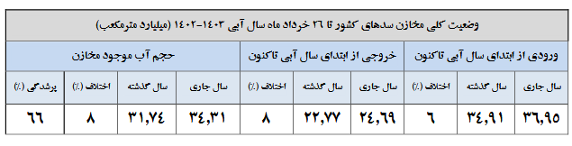 میزان ورودی مخازن کل کشور از ابتدای سال آبی (ابتدای مهرماه) تا ۲۶ خردادماه معادل ۳۶.۹۵ میلیارد متر مکعب بوده که در قیاس با سال گذشته که عددی معادل ۳۴.۹۱ میلیارد مترمکعب بوده ۶ درصد کاهش داشته است. همچنین میزان کل خروجی سدهای کشور نیز نسبت به سال قبل با هشت درصد افزایش مواجه بوده است.