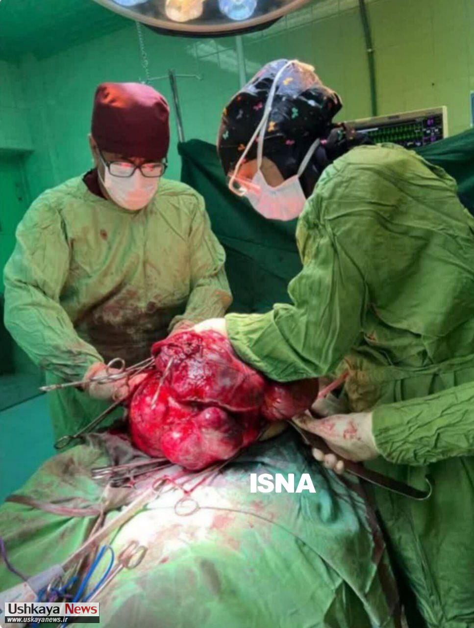 🔹بیمار، خانم ۴۲ ساله است که با تومور بزرگ و وسیع داخل لگن و شکم، تحت عمل جراحی ۴ ساعته قرار گرفت و تومور ۱۱ کیلویی از بدن بیمار خارج شد.