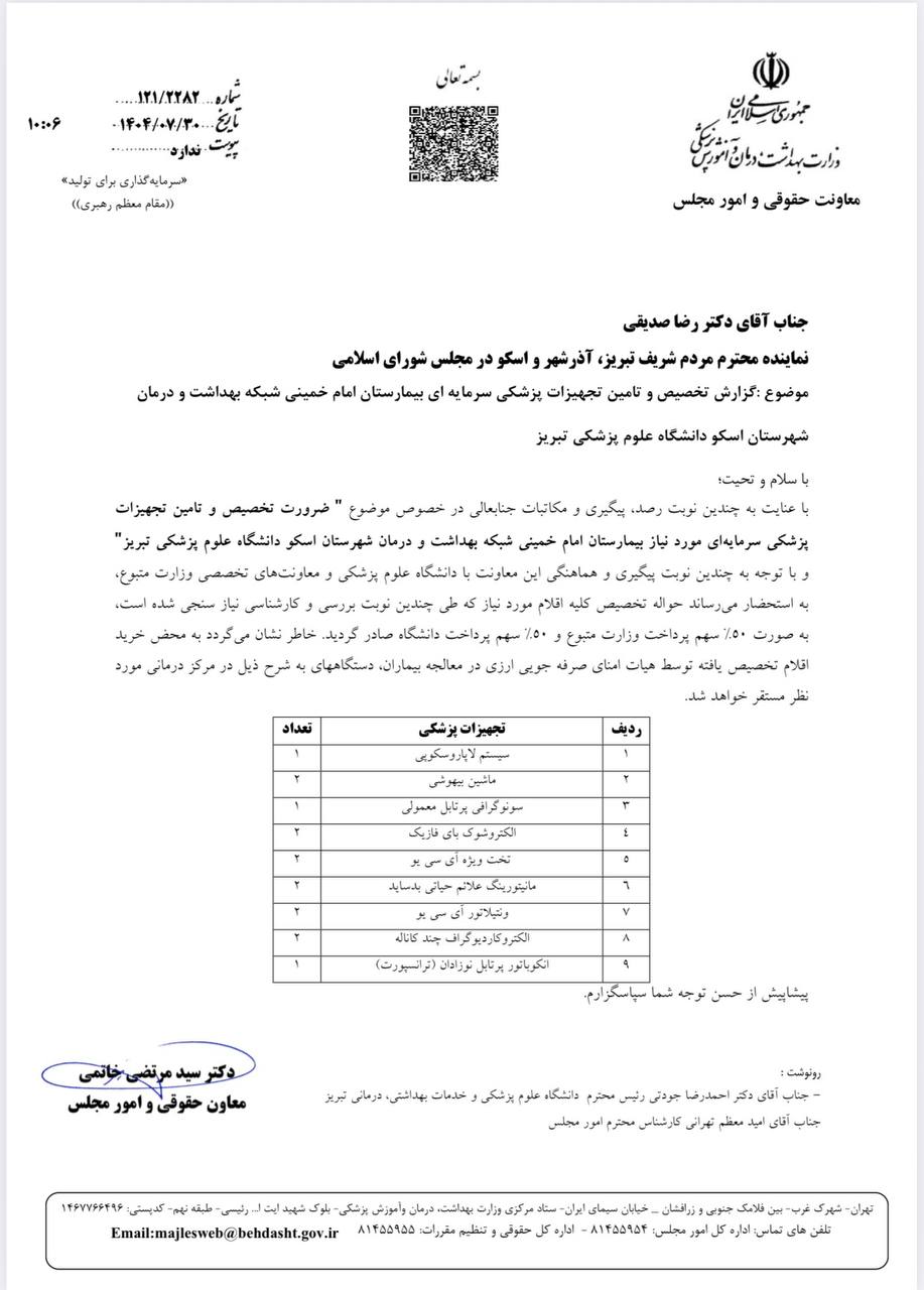 «ارتقای زیرساختهای سلامت در مناطق مختلف استان یکی از اولویتهای اصلی ماست. مردم آذرشهر و اسکو شایستهی دسترسی به خدمات درمانی باکیفیت و تجهیزات بهروز هستند.»